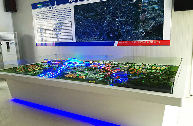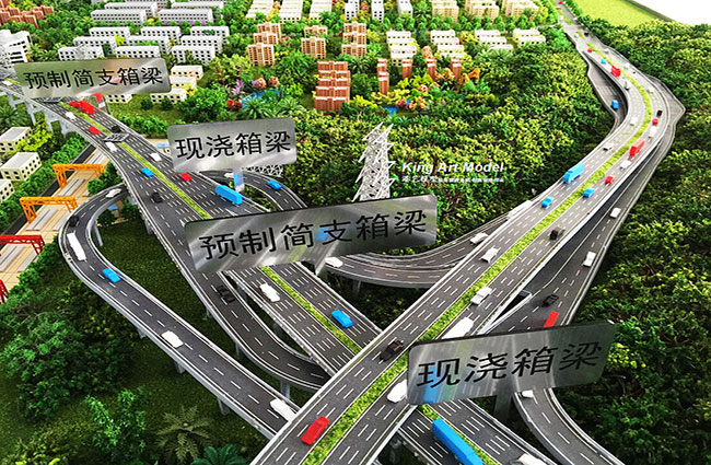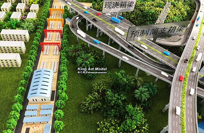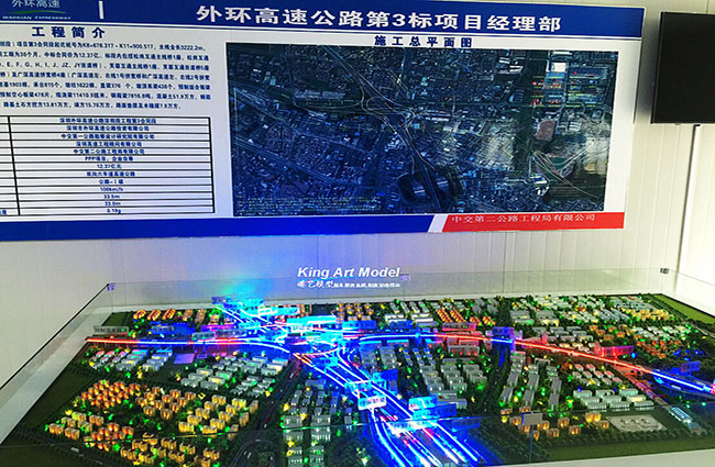 此次,中交二公局承接了深圳外環(huán)高速松崗三標(biāo)段項(xiàng)目工程施工。為了更好的引導(dǎo)工程施工進(jìn)度及難度,中交二公局委托深圳市港藝模型藝術(shù)設(shè)計(jì)有限公司打造松崗三標(biāo)段沙盤(pán)模型,根據(jù)提供的圖紙,沙盤(pán)模型精細(xì)的體現(xiàn)了:立交互通的每一個(gè)細(xì)節(jié),行車(chē)線、路面、路肩、防撞護(hù)欄、橋墩、互通國(guó)道及市政道路的連接、收費(fèi)站等高速配套。在高速路面上,港藝設(shè)計(jì)了各式車(chē)輛,有小汽車(chē),小貨車(chē),大貨車(chē),大巴車(chē)等,還原道路真實(shí)效果。