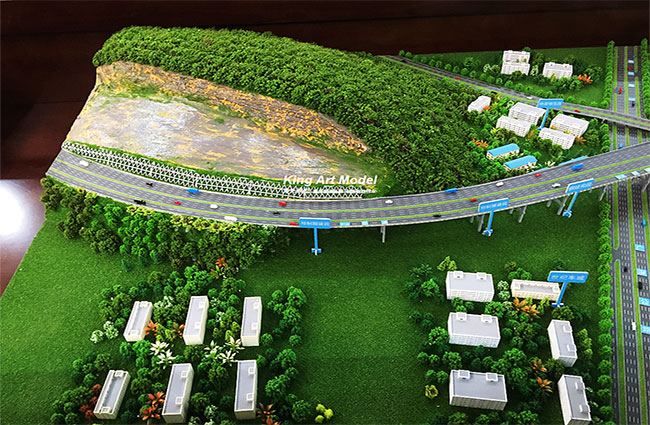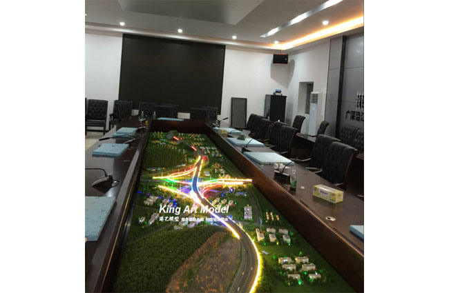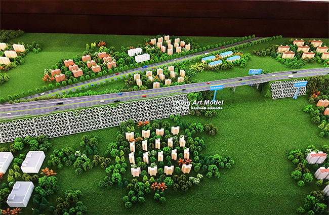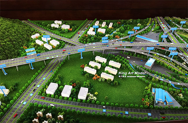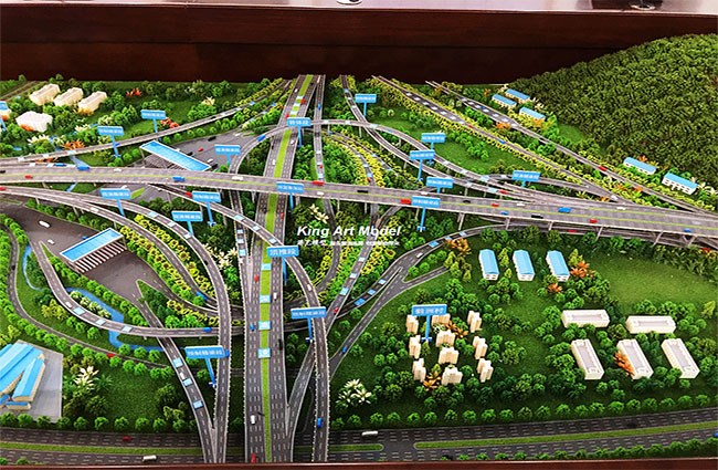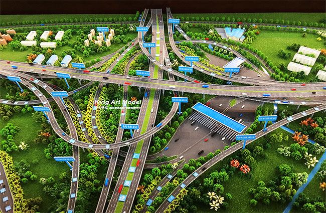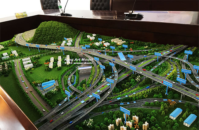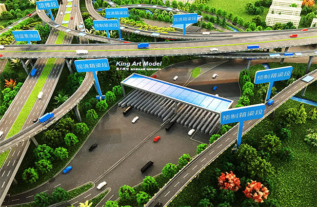 為了更好的引導(dǎo)施工進(jìn)度及難度,路橋集團(tuán)委托深圳市港藝模型藝術(shù)設(shè)計(jì)有限公司打造鶴洲立交沙盤模型,根據(jù)提供的圖紙,沙盤模型精細(xì)的體現(xiàn)了立交互通的每一個(gè)細(xì)節(jié):行車線、路面、路肩、防撞護(hù)欄、橋墩、涵洞、互通國道及市政道路的連接、收費(fèi)站等高速配套。
