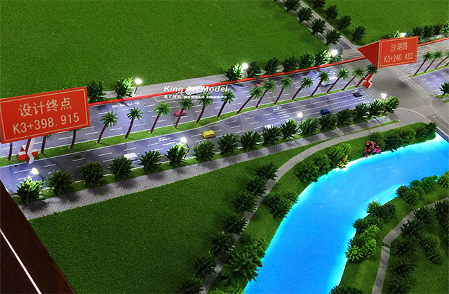 港藝公司根據(jù)坪山大道南段“青山環(huán)繞,水抱城流,園道格致,城景和一”的設(shè)計(jì)理念。展示全路段每個(gè)項(xiàng)目部的所在位置,項(xiàng)目部及周邊建筑均采用寫實(shí)制作手法,設(shè)置不同的燈光效果,并分組進(jìn)行控制。在項(xiàng)目部、重點(diǎn)建筑、主要橋梁、起點(diǎn)和終點(diǎn)都設(shè)置了精美的標(biāo)示牌。景觀周邊水系、綠植、采用寫實(shí)制作,種植綠化和設(shè)置燈光,使整個(gè)沙盤更加豐富逼真,還原城市真實(shí)場(chǎng)景。