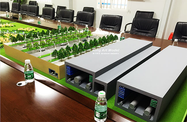 在道路路面上,港藝設(shè)計(jì)了各式車輛,小汽車、大巴車、公交專用車道等路線行駛車道,還原道路真實(shí)場(chǎng)景。同時(shí)重要路段及地下管廊功能,做了剖面示意展示,便于施工中對(duì)項(xiàng)目的精準(zhǔn)的推敲。