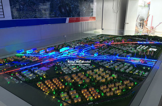 周邊住宅建筑及廠房用不同的顏色和不同燈光區(qū)分體現(xiàn),周邊山體寫(xiě)實(shí)制作,種植綠化和設(shè)置燈光,使整個(gè)沙盤(pán)更加豐富,更加逼真。