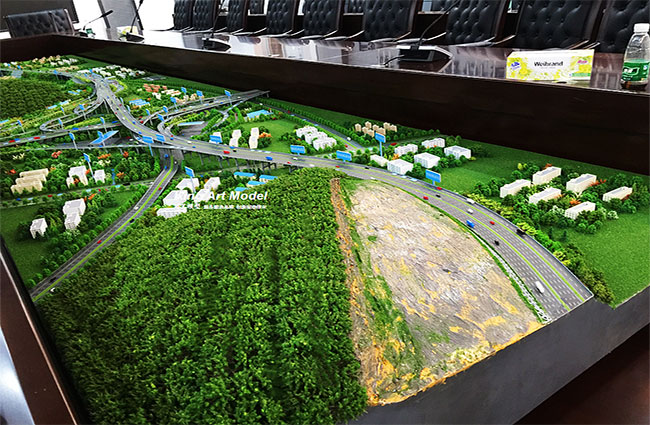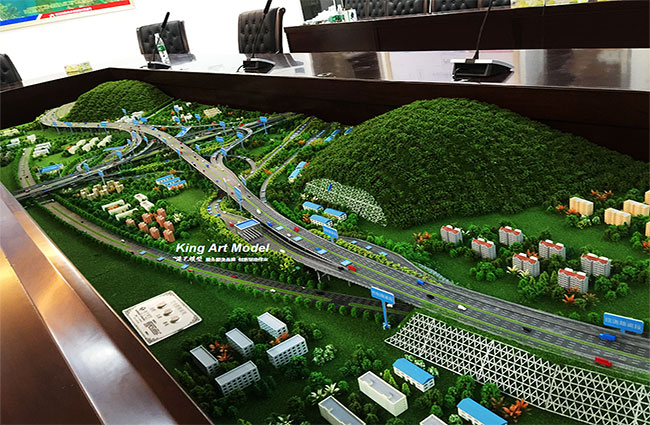 為了更好的引導(dǎo)施工進(jìn)度及難度,路橋集團(tuán)委托深圳市港藝模型藝術(shù)設(shè)計(jì)有限公司打造鶴洲立交沙盤模型,根據(jù)提供的圖紙,沙盤模型精細(xì)的體現(xiàn)了立交互通的每一個(gè)細(xì)節(jié):行車線、路面、路肩、防撞護(hù)欄、橋墩、涵洞、互通國道及市政道路的連接、收費(fèi)站等高速配套。
