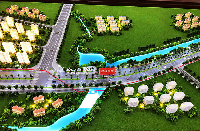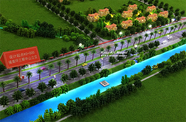 港藝公司根據(jù)坪山大道南段“青山環(huán)繞,水抱城流,園道格致,城景和一”的設(shè)計(jì)理念。展示全路段每個(gè)項(xiàng)目部的所在位置,項(xiàng)目部及周邊建筑均采用寫實(shí)制作手法,設(shè)置不同的燈光效果,并分組進(jìn)行控制。在項(xiàng)目部、重點(diǎn)建筑、主要橋梁、起點(diǎn)和終點(diǎn)都設(shè)置了精美的標(biāo)示牌。景觀周邊水系、綠植、采用寫實(shí)制作,種植綠化和設(shè)置燈光,使整個(gè)沙盤更加豐富逼真,還原城市真實(shí)場(chǎng)景。